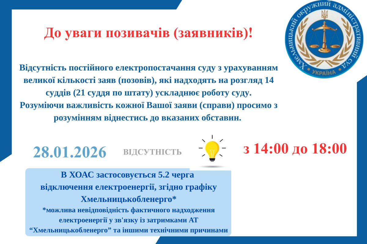 ІНФОРМАЦІЯ ПРО ВІДСУТНІСТЬ ЕЛЕКТРОЕНЕРГІЇ В ХМЕЛЬНИЦЬКОМУ ОКРУЖНОМУ АДМІНІСТРАТИВНОМУ СУДІ