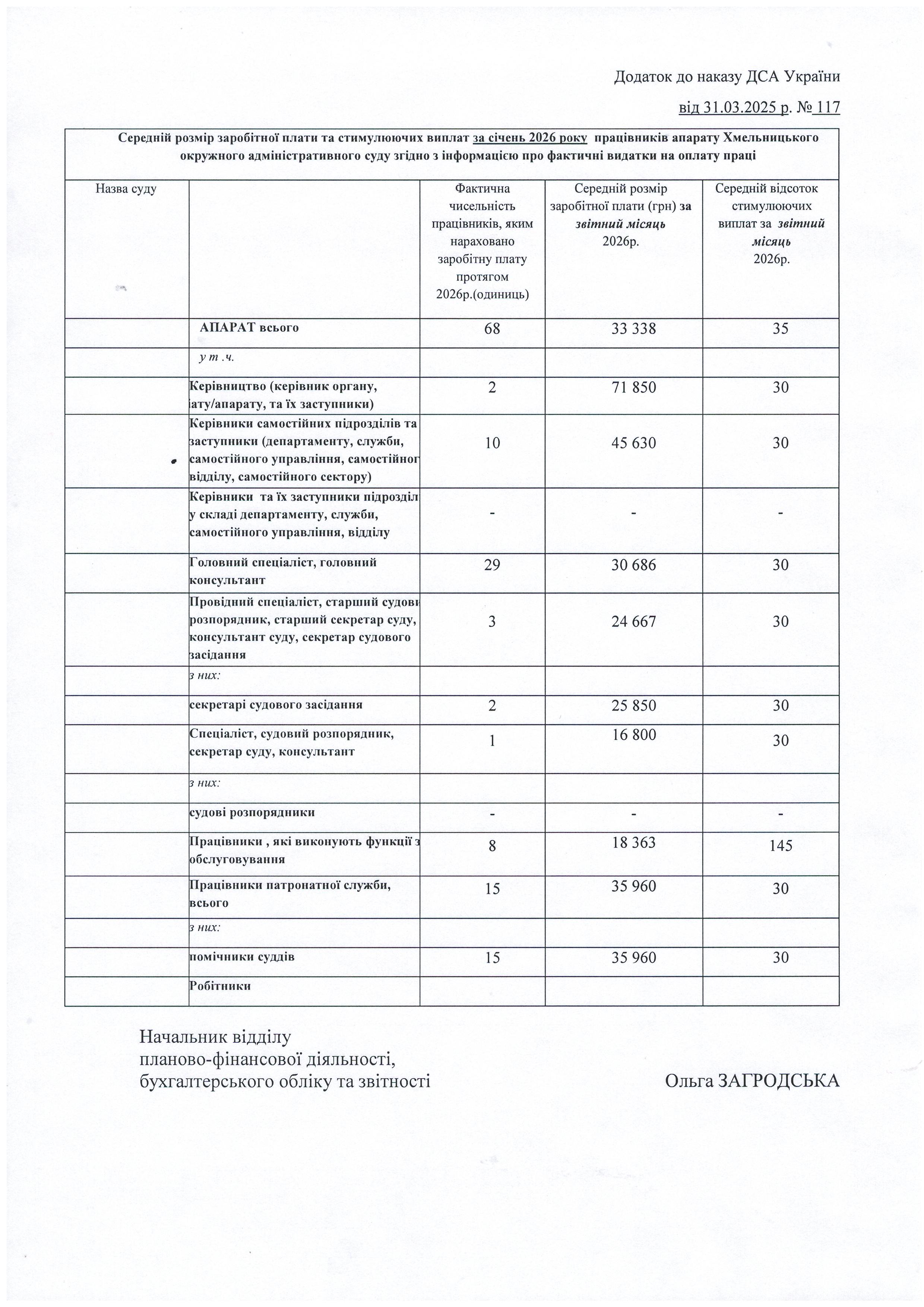 Середній розмір заробітної плати та стимулюючих виплат за січень 2026 року працівників апарату суду